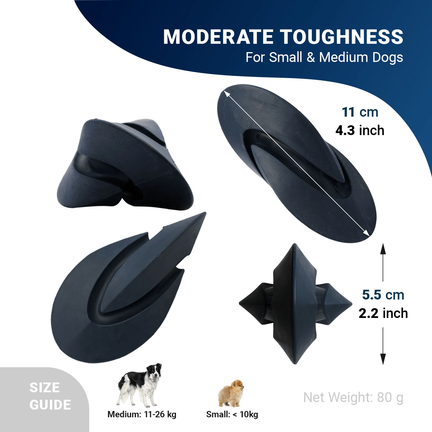 Double the angles, double the fun. The Geo‑Duo encourages active play and mental stimulation. Its unique shape rolls unpredictably, while grooves allow for soft treats or spreads. Made from natural rubber, a more sustainable alternative to plastics, it’s perfect for medium chewers.